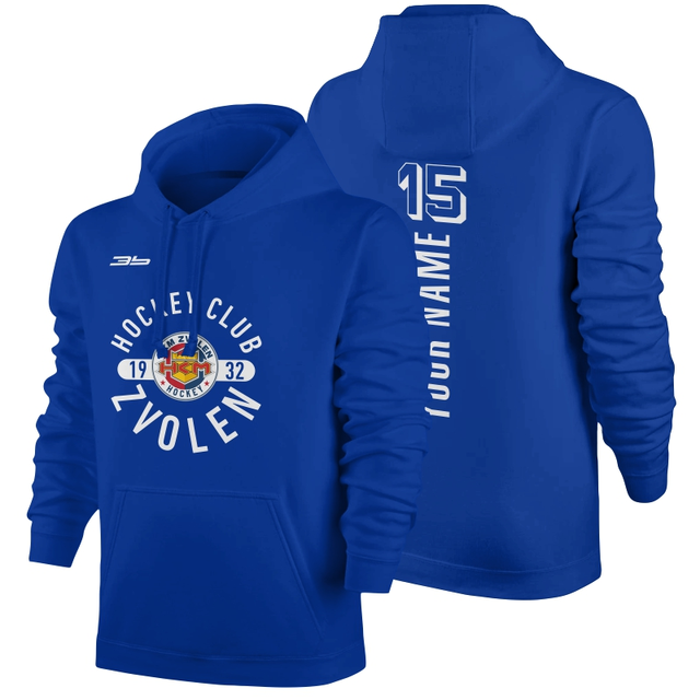 Bavlnená mikina s kapucňou a klokaním vreckom s logom HKM Zvolen. Mikina má dvojitú kapucňu so sťahovacou šnúrkou, všité rukávy, bez bočných švov. Má rebrový lem s elastanom na manžetách a spodnom okraji. Možnosť dotlače mena a čísla za príplatok.