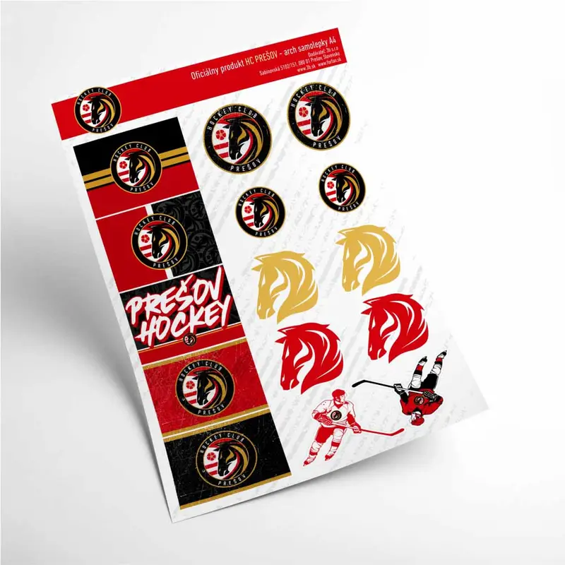 Kolekcia dekoračných samolepiek Vášho obľúbeného klubu v rôznych veľkostiach. Nálepky sa dajú použiť na všetky hladké povrchy. Rozmer hárku je vo veľkosti A4. Oficiálny produkt firmy 3b s.r o. , ktorá je oficiálnym držiteľom licenčných práv súvisiacich s merchandisingovými výrobkami HC Prešov. Prípadné informácie pred zaslaním objednávky Vám môžeme poskytnúť na tel. čísle 0918 966 245 alebo forfan@3b.sk.