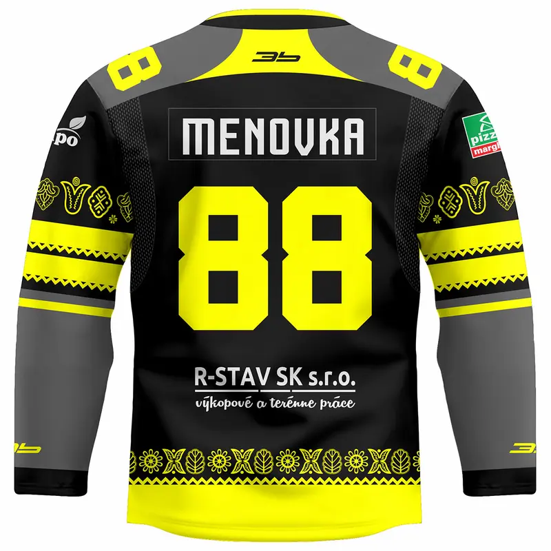 Originálny hokejový dres celopotlačený vyrobený sublimačnou* metódou z 220gr/m2 100% PES s vetracími časťami, spevneným sedlom z 300g/m2 látky, profi golier s čistiacim pásikom...