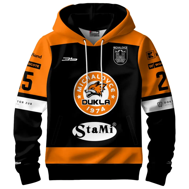 Mikina z hrubej teplakoviny s kapucňou, s patentami a so zipsom vyrobená z 300g/m² látky. Mikina je potlačená sublimačnou* technológiou. Oficiálny produkt firmy 3b s.r o. , ktorá je oficiálnym držiteľom licenčných práv súvisiacich s merchandisingovými výrobkami HK Dukla Michalovce. Prípadné informácie pred zaslaním objednávky Vám môžeme poskytnúť na tel. čísle 0918 966 245 alebo na forfan@3b.sk