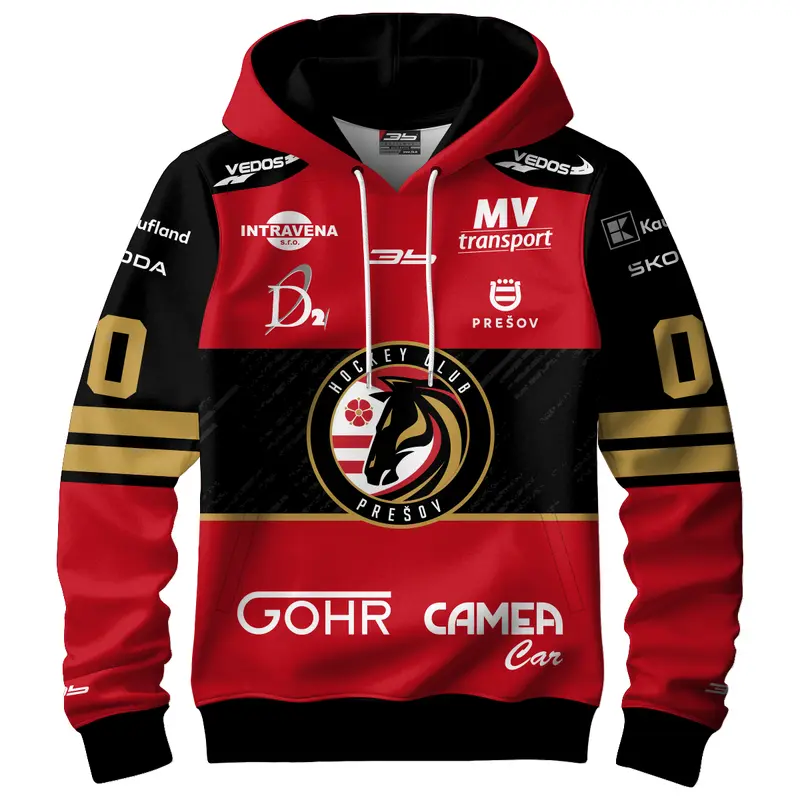 Mikina z hrubej teplakoviny s kapucňou, s patentami a so zipsom vyrobená z 300g/m² látky. Mikina je potlačená sublimačnou* technológiou. Oficiálny produkt firmy 3b s.r o. , ktorá je oficiálnym držiteľom licenčných práv súvisiacich s merchandisingovými výrobkami HC Prešov. Prípadné informácie pred zaslaním objednávky Vám môžeme poskytnúť na tel. čísle 0918 966 245 alebo na forfan@3b.sk