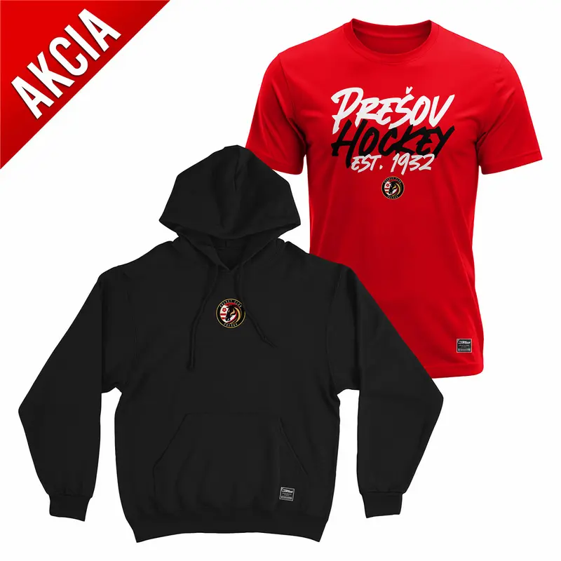 Akciový balík obsahuje bavlnenú mikina s kapucňou a bavlné tričko s logom HC Prešov...